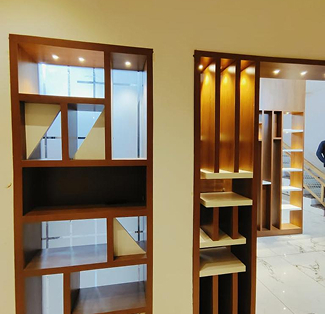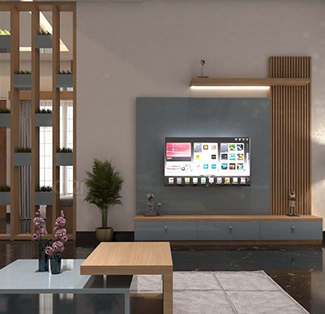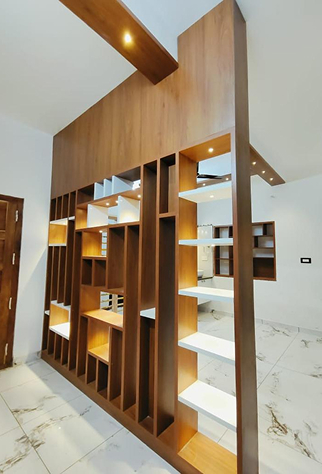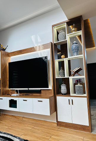 In order to have a well designed and welcoming living room, TV unit, centre table, sofa set, dosplay unit, book shelf, wall paneling, prayer unit, partitioning and shoe rack are needed. Materials Used: